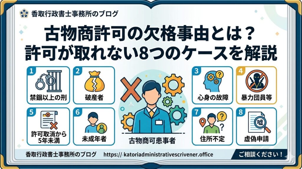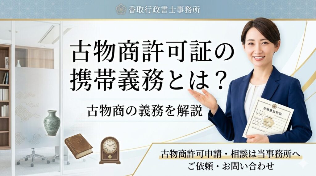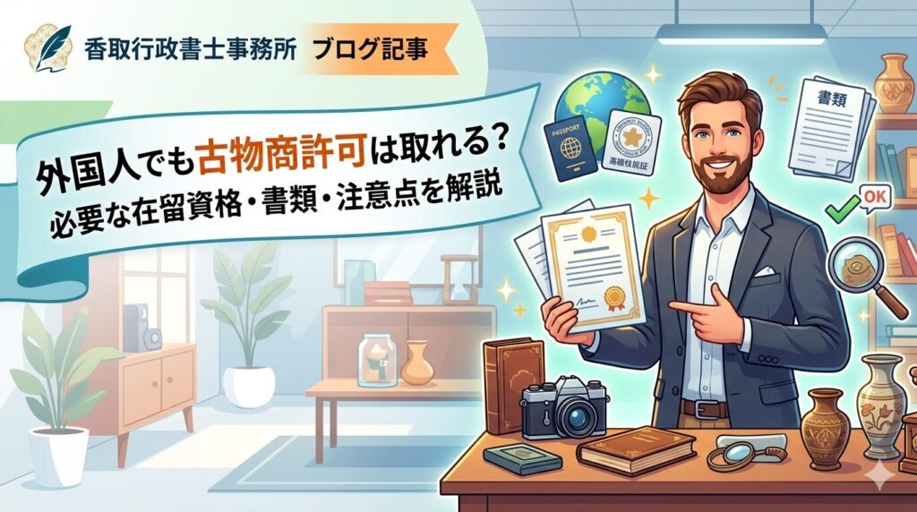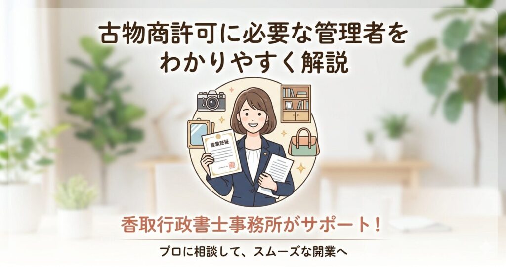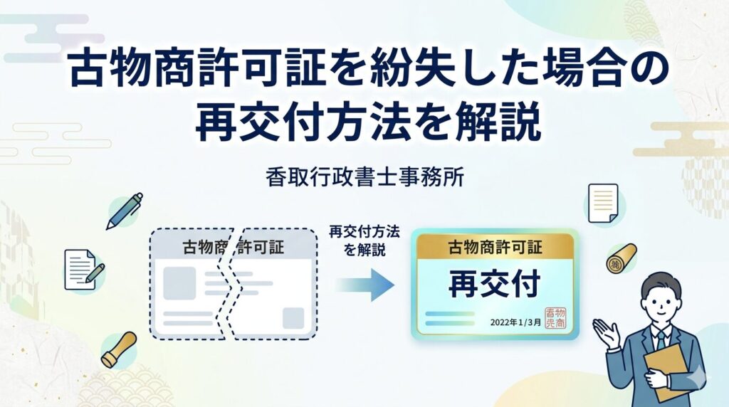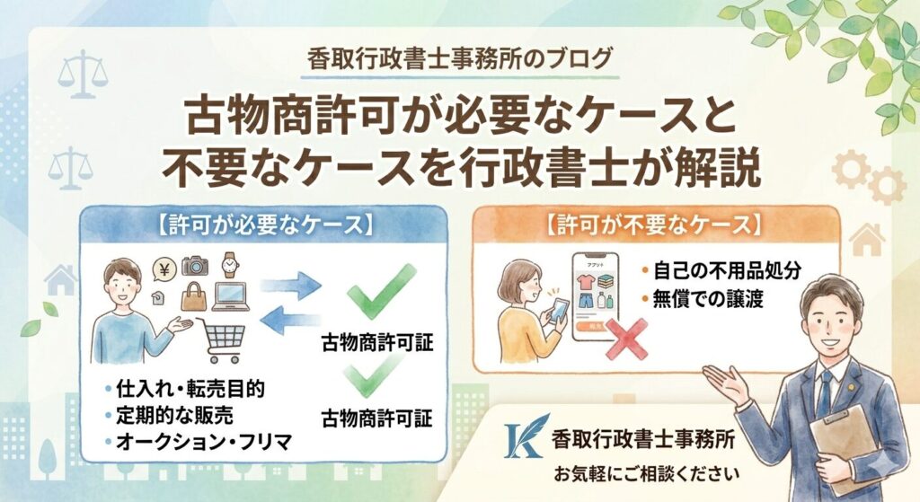 ネット販売・フリマアプリ・リユースショップ開業に必要な古物商許可をスムーズに取得。書類作成から警察署対応まで一括サポートいたします。