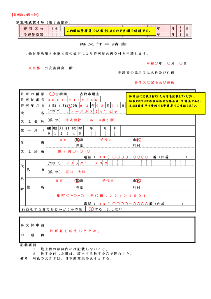 再交付申請書の記載例が警視庁ホームページにありましたので貼り付けておきます。参考にしてください。