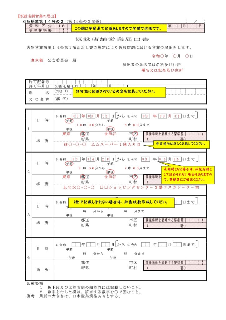 ただし、仮設店舗を管轄する公安委員会の区域内に営業所がない場合は、営業所のある所在地を管轄する警察署を経由して、仮設店舗を管轄する公安委員会に提出することもできます。